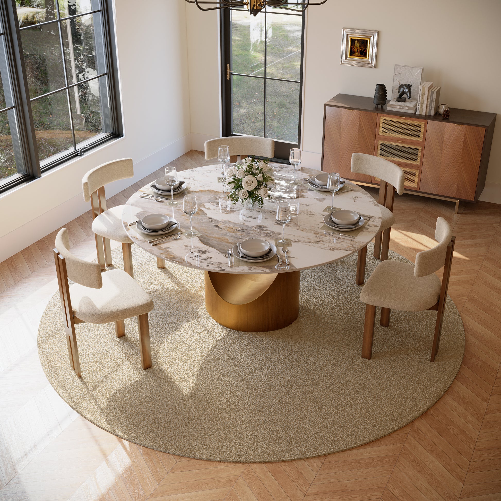 هذي طاولة الطعام تعتبر تحفة فنية تناسب المناسبات الرسمية والاستخدام اليومي في البيت. القاعدة مصممة بشكل حرف U مجوف، بتصميم أنيق وفريد. القاعدة المنحنية تعطي تباين جميل مع السطح الدائري، مما يخلق إحساسًا هندسيًا لافتًا للنظر. الطاولة مو بس جميلة، لكنها قوية ومتينة بعد. المساحة الكبيرة على السطح تتيح لعدد كبير من الأشخاص الأكل والتحدث براحة.
